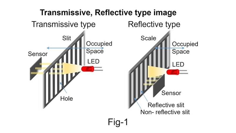光电传感器可以采用两种位置感测方法:透射式和反射式。如图 1 左图所示,透射式感测是指 LED 发出的光线穿过刻度盘上的一系列狭缝,到达另一侧的光电传感器。反射式感测是指(如图 1 右图所示)LED 和传感器位于刻度盘的同一侧,LED 发出的光线经过刻度盘的反射狭缝(反射狭缝与非反射狭缝交替出现)反射后到达传感器。
