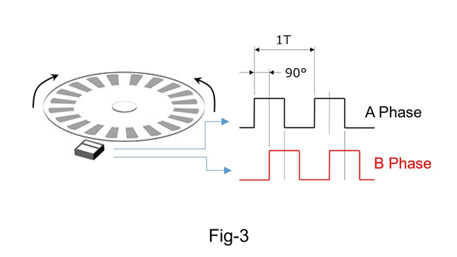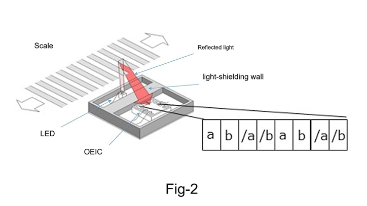 在操作过程中,当一个带有交替反射和非反射图案的刻度尺固定在一个运动部件上,并经过 OEIC 时,OEIC 接收到的图像会发生变化。响应这些变化,OEIC 会产生一个两相(A 和 B)脉冲信号,其相位差为 90 度,与交替图案周期相匹配(图 3)。微控制器单元 (MCU) 可以检测这些脉冲,并得出运动部件的位置、距离、方向和速度。NJL5820/21/22R 系列产品的位置检测分辨率分别为 50.8LPI、150LPI 和 180LPI (Line Per Inch)。