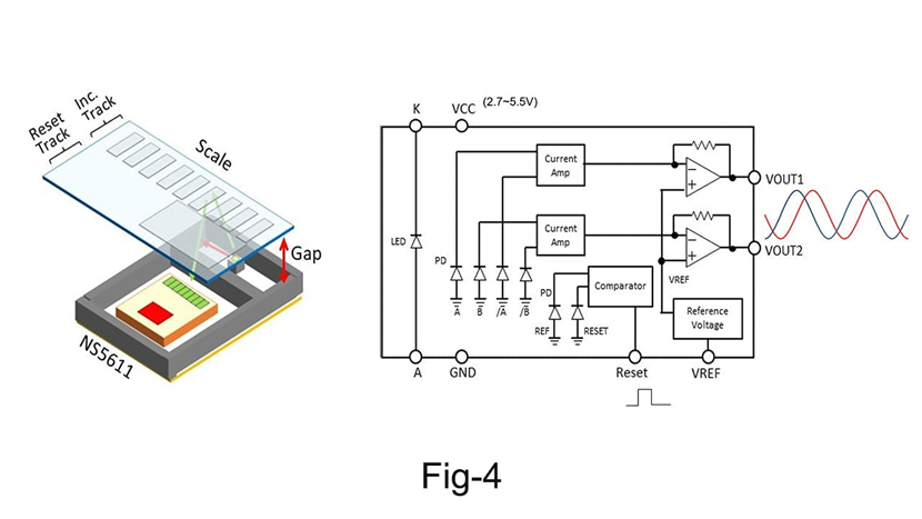 日清纺微电子的模拟输出光电位置传感器有 NS5611,是一款可用于反射式增量式光学编码器的产品。 NS5611 封装包含一个近红外 LED 和一个 OEIC。 当反射式刻度尺经过传感器时(图 4 左),该器件会除了可以产生A,B两相,相位角为 90 度,每周期 140 µm的模拟输出(红色和蓝色波形,图 4 右), 还带有可用于原点检测的Z相输出(Reset输出), 用户可自选ADC,以将这些信号数字化后,用自选MCU来计算移动的距离。