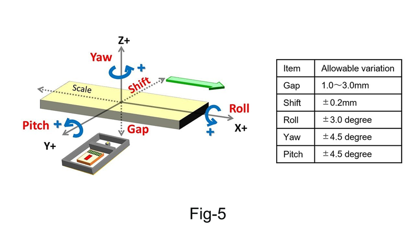 将光电式位置传感器用于光学编码器时,必须考虑多个设计方面。通常,高分辨率位置传感器不适用于柔性印刷电路材料, 因为任何弯曲都会改变栅尺与传感器之间的位置关系,从而影响分辨率。 然而,NS5611 的坚固设计使其能够承受栅尺相对于设备的位置变化。图 5 显示了栅尺与传感器之间的间隙Gap、栅尺位移Shift以及栅尺翻滚Roll、俯仰pitch和偏向Yaw的允许范围。