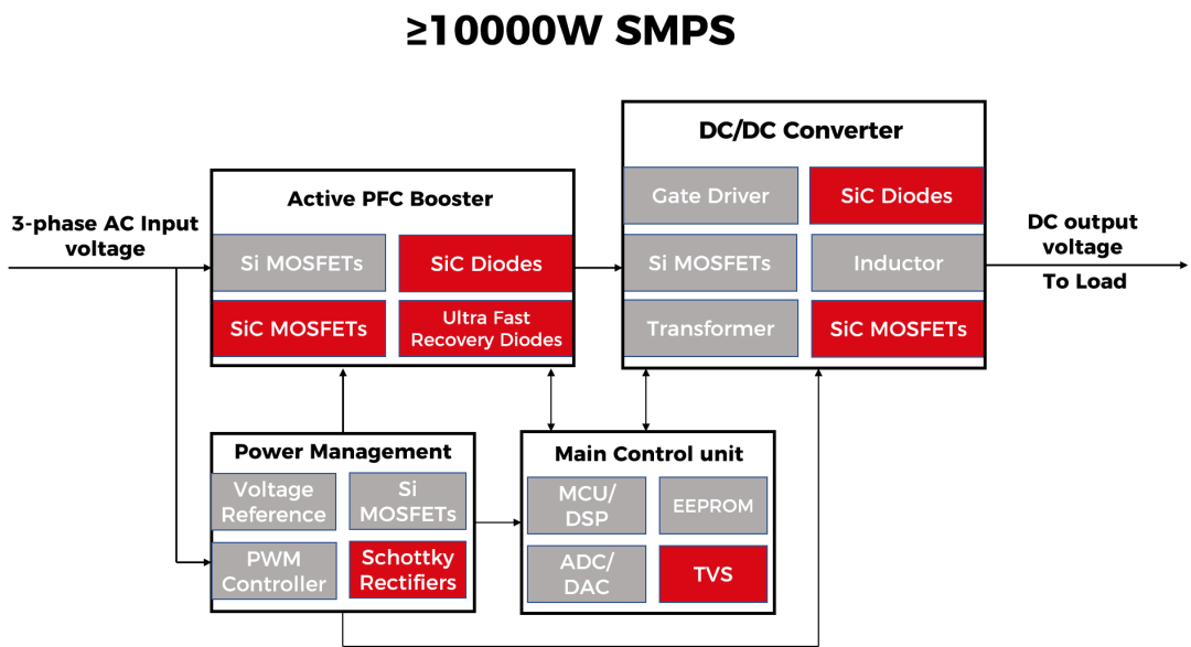 大功率SMPS的设计通常遵循两级架构:PFC(功率因数校正)和隔离DC/DC转换。每个环节都对功率器件提出了严苛的要求。