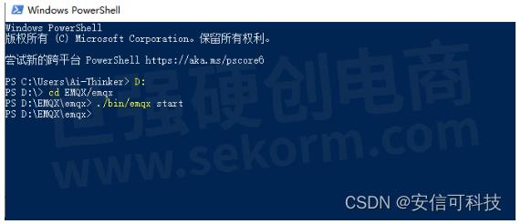 将下载好的EMQX软件解压到自定义路径中,如本机路径为:D:\EMQX\emqx,打开Windows PowerShell,指定到EMQX软件的路径,输入“./bin/emqx start”命令,若无报错,即服务器开启成功。