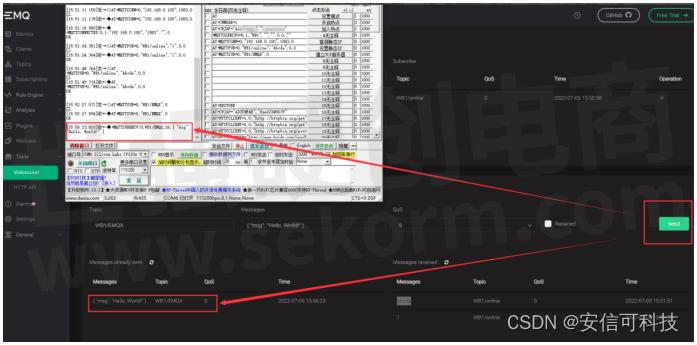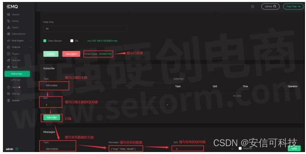 ②进入Dashboard界面,点击Tools,选择Websocket,点击“Connect”;在Subscribe对话框中,Topic内容填写“WB1/online”,Qos选择0,点击Subscribe;在Message对话框中,Topic内容填写“WB1/EMQX”,Message内容填写“abcde”,Qos选择0。