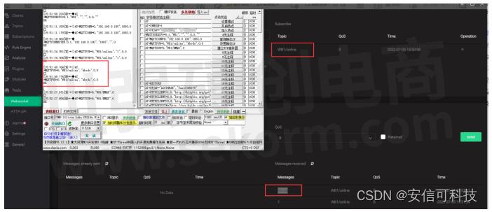 在Dashboard界面中将设置好的Message数据send出去之后,串口将显示接收到的数据内容,包括QOS值以及消息内容,效果如下: